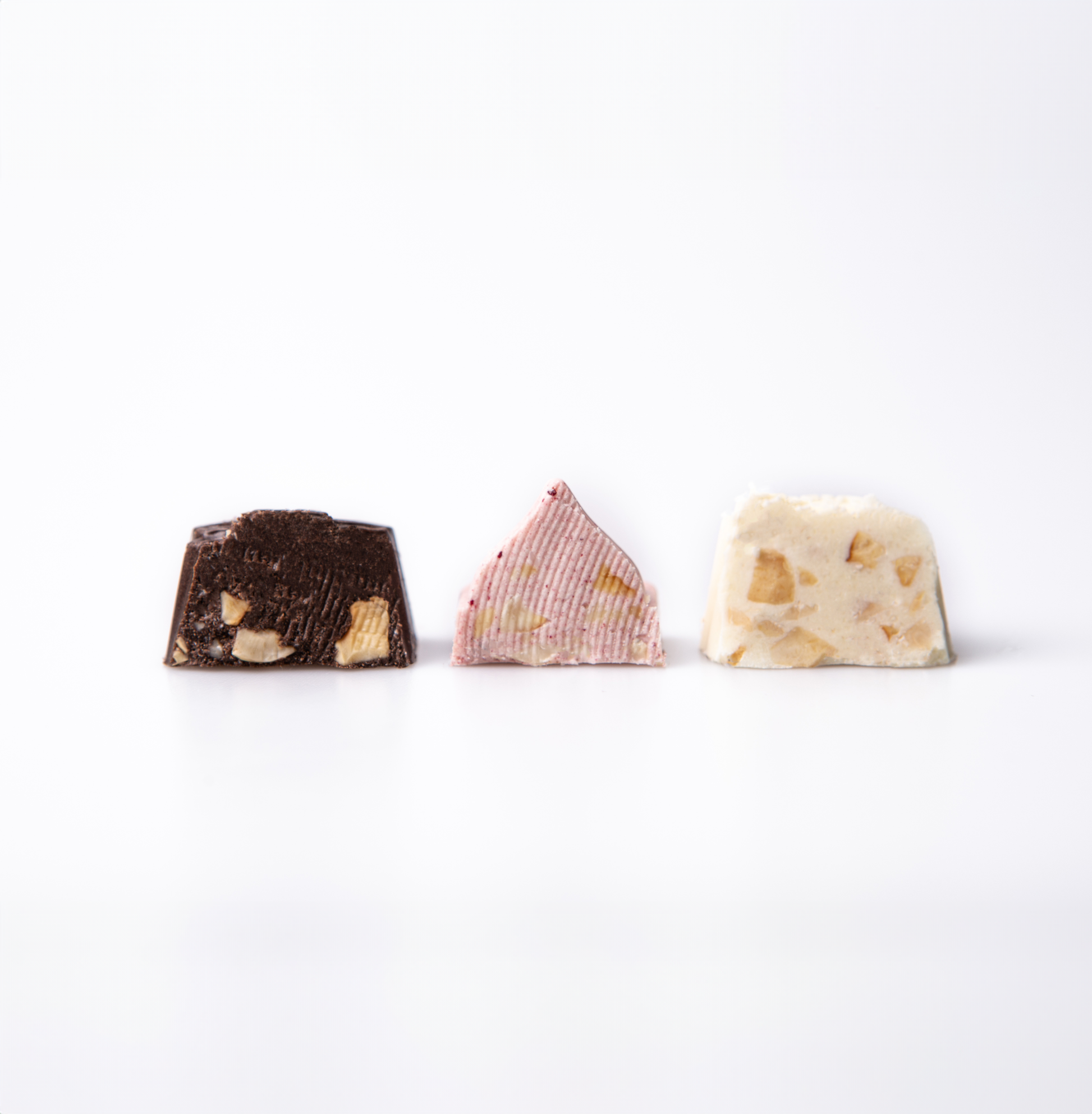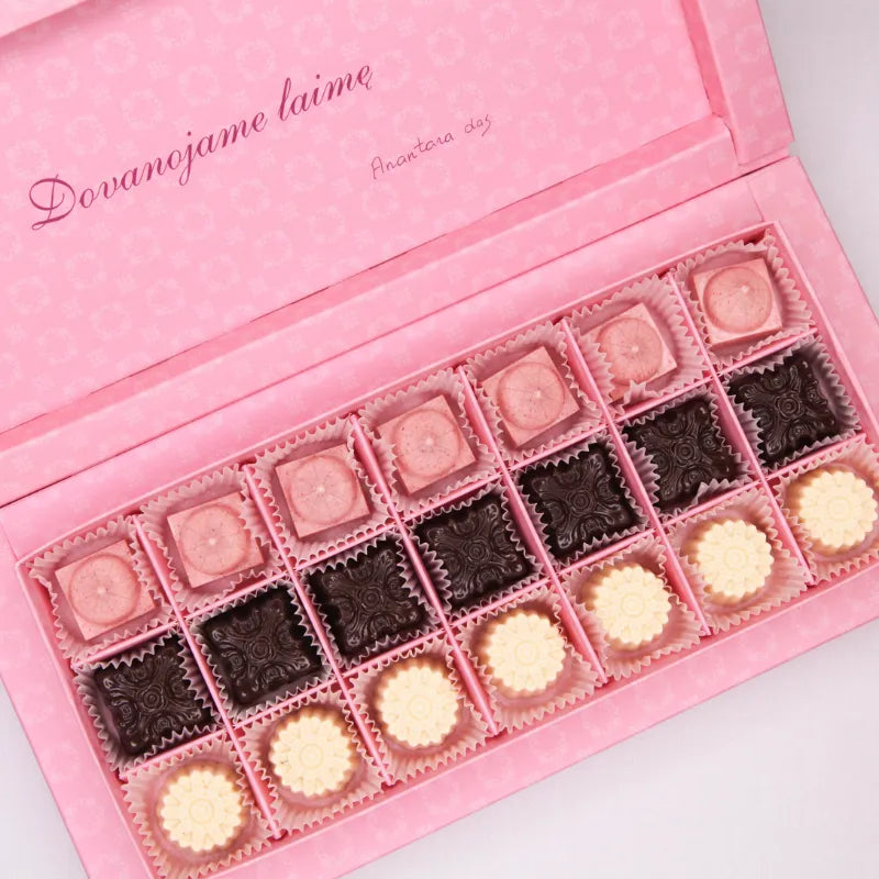 Rankų darbo saldainiai PREMA – elegantiško dizaino dėžutėje rasite trijų skonių šokoladinius saldainius: kerobinius, baltojo šokolado su avietėmis ir baltojo šokolado su lazdynų riešutais.