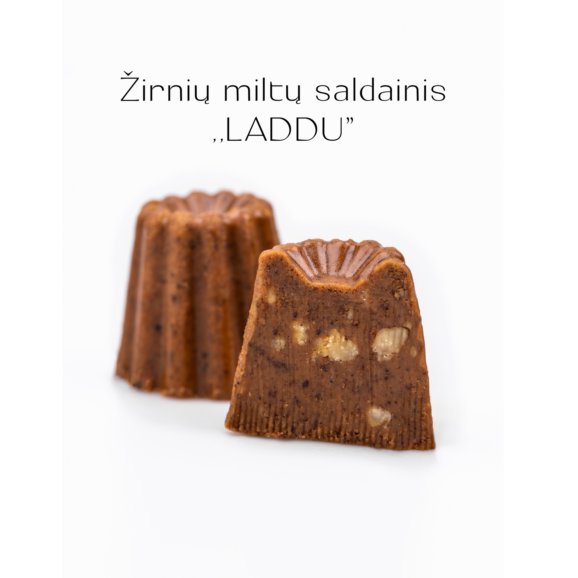 “LADDU” sudėtis: Sviestas, žirnių miltai, maltas kardamonas, cinamonas, kokosų drožlės, graikiniai riešutai, cukraus pudra.