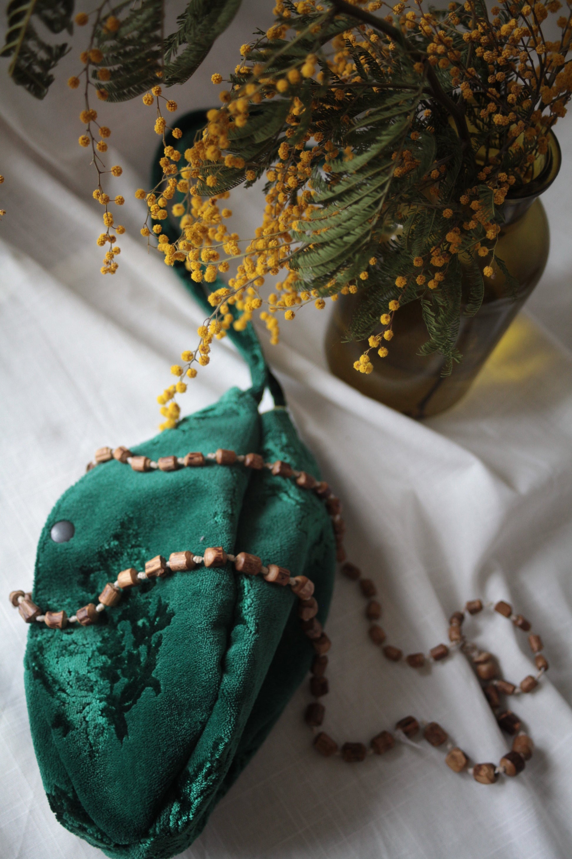 Žieminis žaliasmalldos karoliukų maišelis su paslėpta kišenėle viduje rodomąjam pirštui