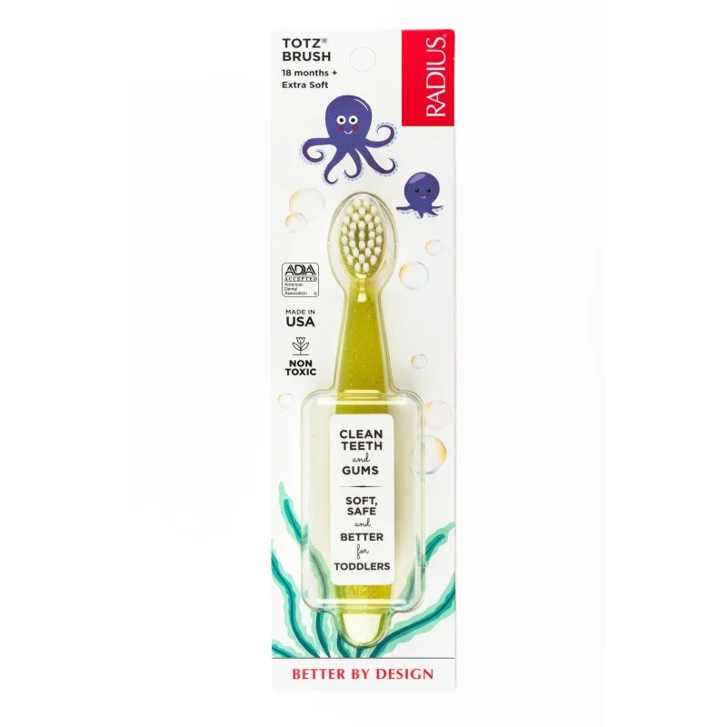 Idealiai atitinkantis vaiko amžių dizainas – nuo 18 mėnesių iki 5 metų. Patentuoti ADIUS® šereliai – 6800 aukščiausios kokybės ypatingai švelnių šerelių, skirtų patogiai, veiksmingai ir saugiai dantukų priežiūrai. FDA patvirtintas plastikas be bisfenolio – saugus dantukų paviršiams ir gležnoms mažylio dantenoms. Plonėjanti, lenkta dantų šepetėlio rankenėlė patogi augančio vaiko pirštukams ir lengvai kontroliuojama tėvelių. RADIUS® Totz glotni ovali galvutė ir saugus šepetėlio dizainas leidžia pačiam vaikui saugiai valyti dantukus nesibaimintant, kad šepetėlis užklius už augančių dantukų ir dantenų. Spaudimo nereikalaujantis valymas – minkšta šerelių pagalvėlė tolygiai paskirsto spaudimą į dantukus ir dantenas, nuo mažens teisingai formuodama valymo įgūdžius. Galite pasirinkti norimą šepetėlio spalvą iš gausios spalvų patetės. Radius – vienintėliai natūralūs dantų šepetėliai, rekomenduojami ADA (Amerikos odontologų asociacijos)