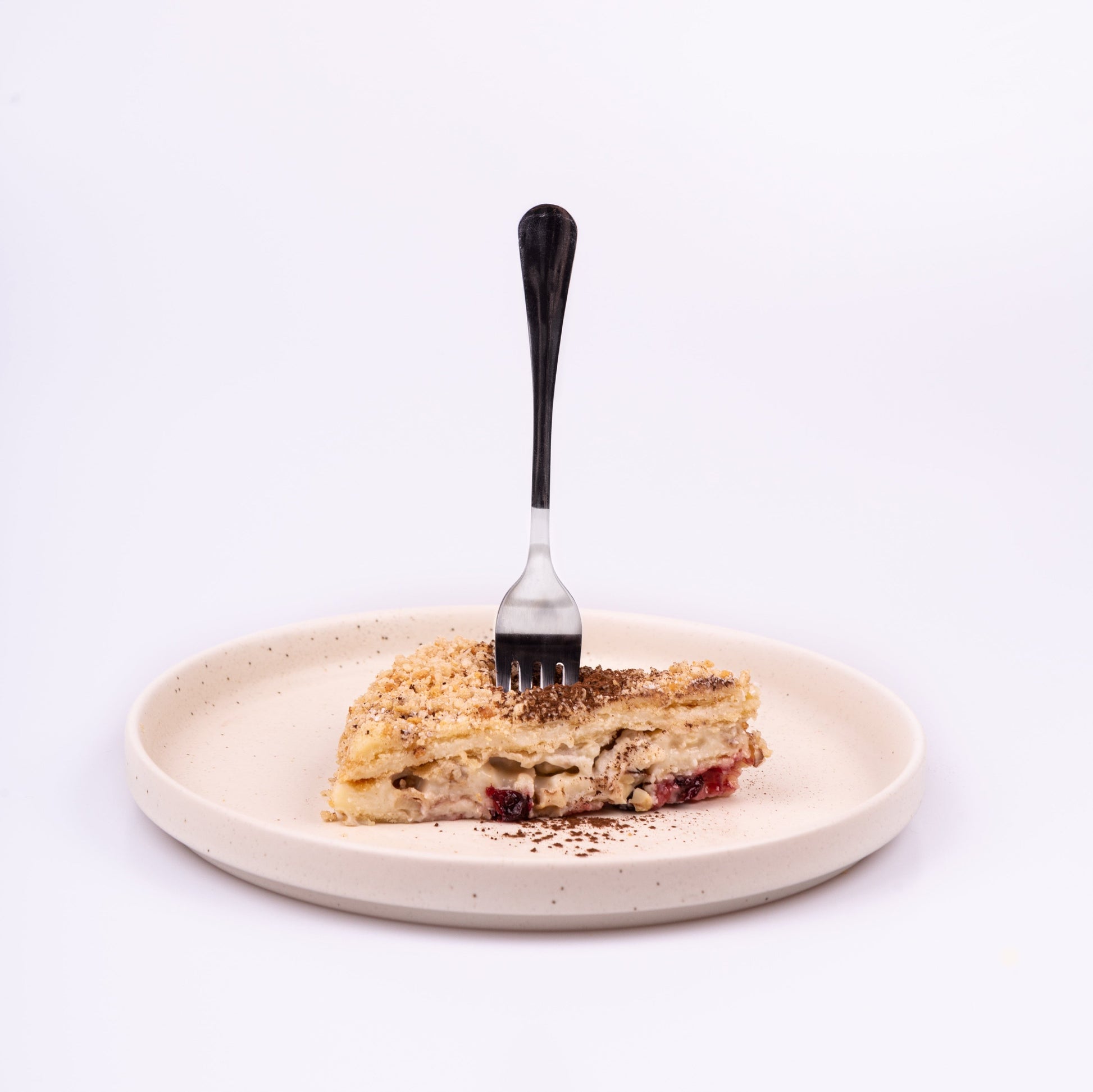 Sudėtis: Lakštai (sviestas, grietinė, speltos miltai, smulki druska), kremas (juodųjų serbentų uogienė, graikiniai riešutai, vanilės aromatas, cukraus pudra, sviestas, krakmolas, speltos miltai, pienas).