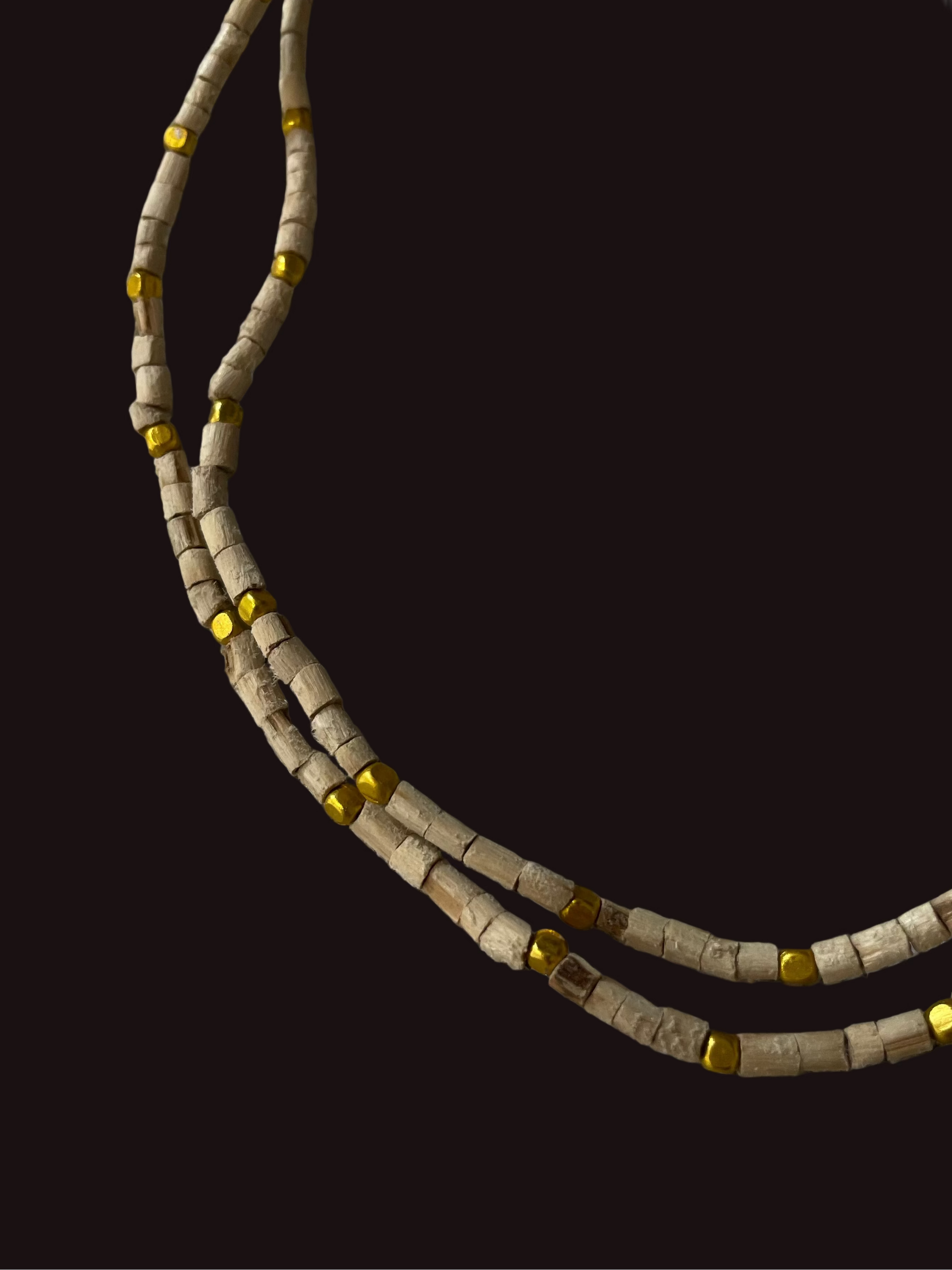 Medžiaga ir reikšmė: Karoliukai gaminami iš šventojo baziliko (Ocimum tenuiflorum) medienos, kuris induizme yra labai garbinamas kaip Tulasi Devi – viena artimiausių Krišnos tarnaičių. Nešiojimas simbolizuoja pasidavimą Viešpačiui Krišnai, tyrumą ir dvasinį ryšį.