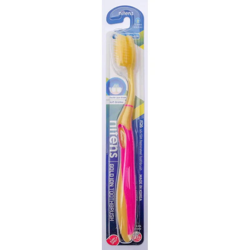 Зубная щетка с золотым покрытием и двойной длиной щетины. Золото уничтожает бактерии, освежает дыхание и обладает регенерирующими свойствами. Зубная щетка эффективно очищает не только лёгкие, но и труднодоступные места. Небольшая, гладкая, гибкая, конусообразная головка зубной щетки способствует этому. Более длинные щетинки легко удаляют остатки пищи из межзубных промежутков, а более короткие хорошо очищают поверхность зубов и легко массируют десны. Диаметр, плотность и количество щетинок подобраны таким образом, чтобы продлить срок службы щетки и обеспечить оптимальную мягкость. Удобная ручка эргономичной формы гарантирует удовольствие от чистки.